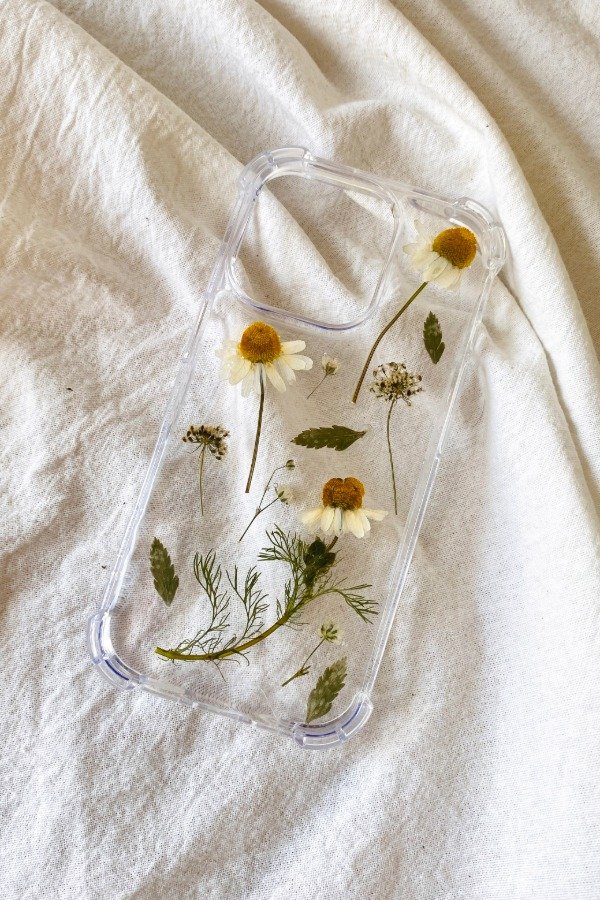 Funda reforzada con esquinas anti golpes para celular personalizada con diferentes flores naturales, cubierta con resina.