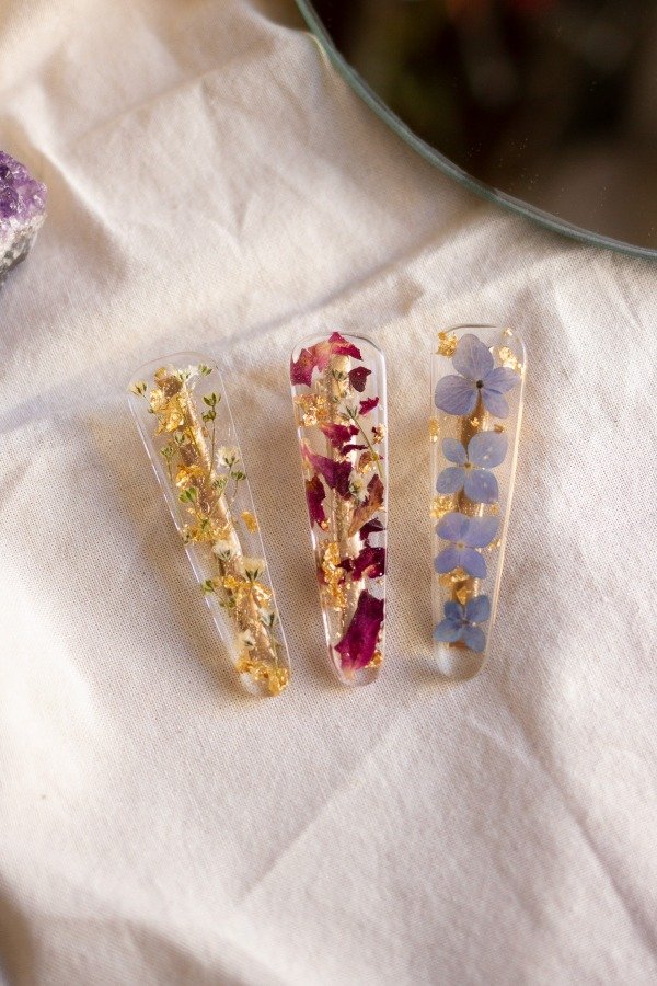 Set de tres hebillas realizadas en resina con flores naturales. Base metálica dorada.