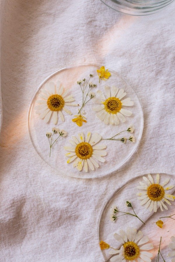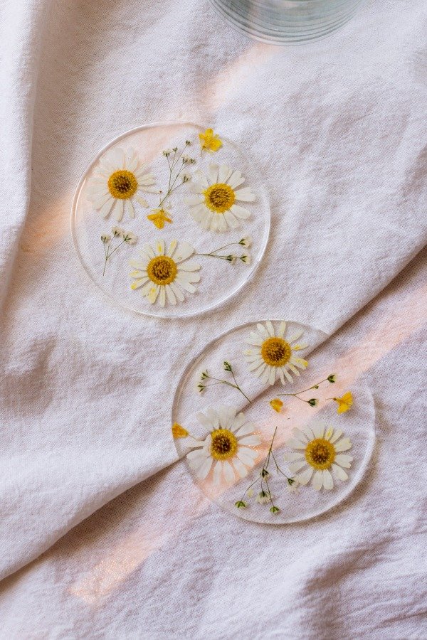 Posavasos de 8cm de diámetro realizados con resina y flores naturales.