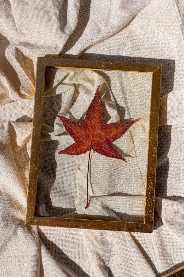 Hoja previamente prensada y secada enmarcada artesanalmente en doble vidrio y varilla oro.