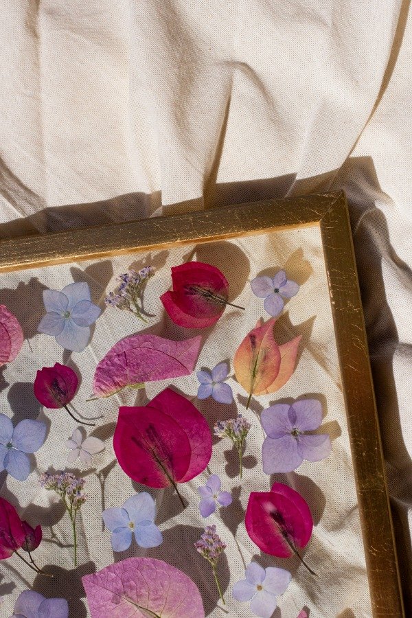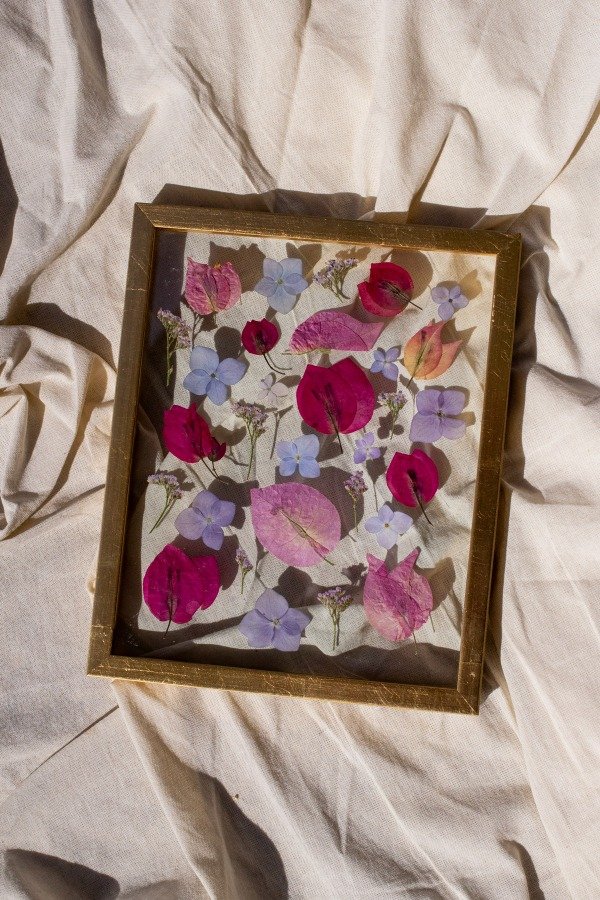 Flores prensadas y secadas, enmarcadas en un marco doble vidrio con varilla oro.