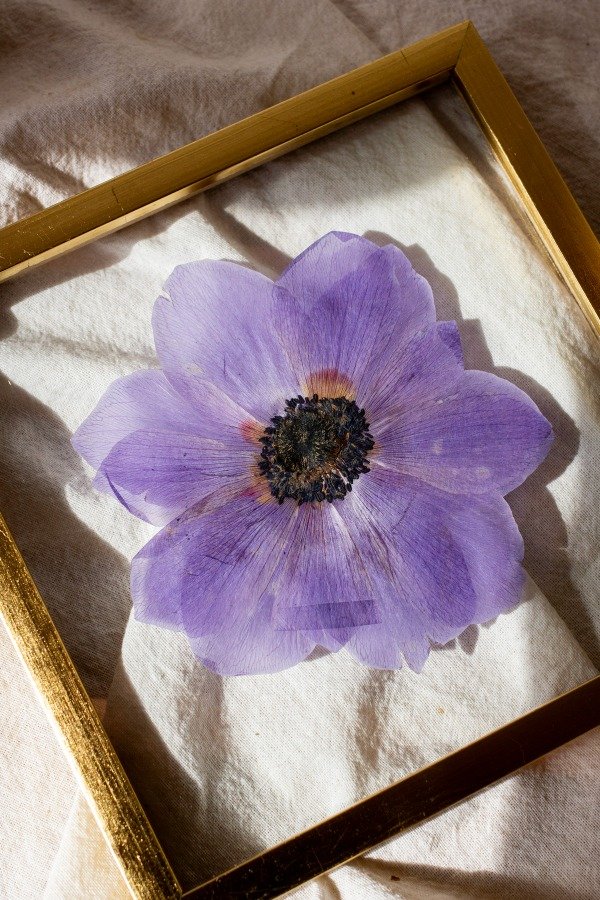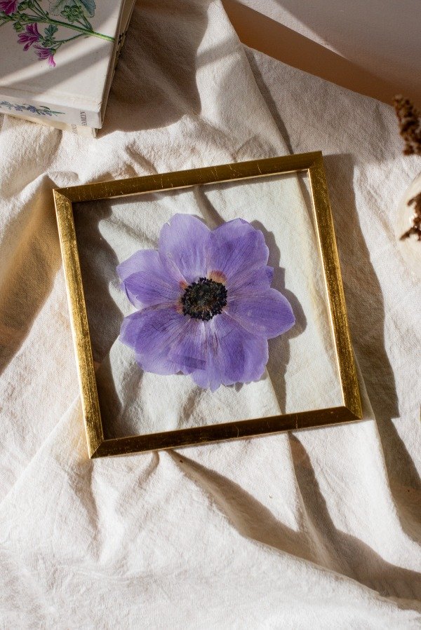 Flor previamente prensada y secada enmarcada artesanalmente en doble vidrio y varilla oro.