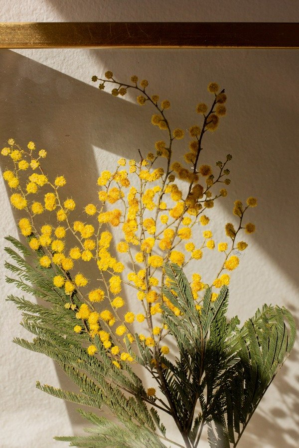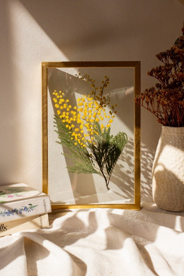 Hojas naturales previamente prensadas y secadas enmarcadas artesanalmente en doble vidrio y varilla oro.
