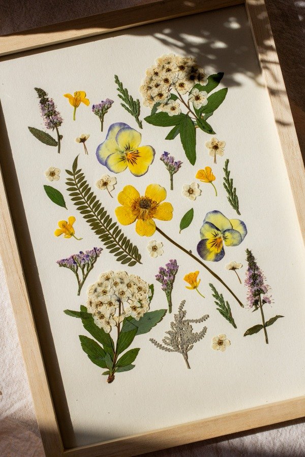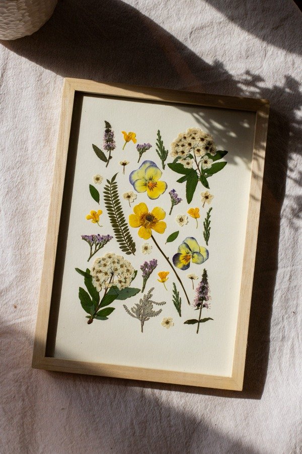 Flores naturales previamente prensadas y secadas enmarcadas artesanalmente en madera marupá y papel fedrigoni de 300gr.