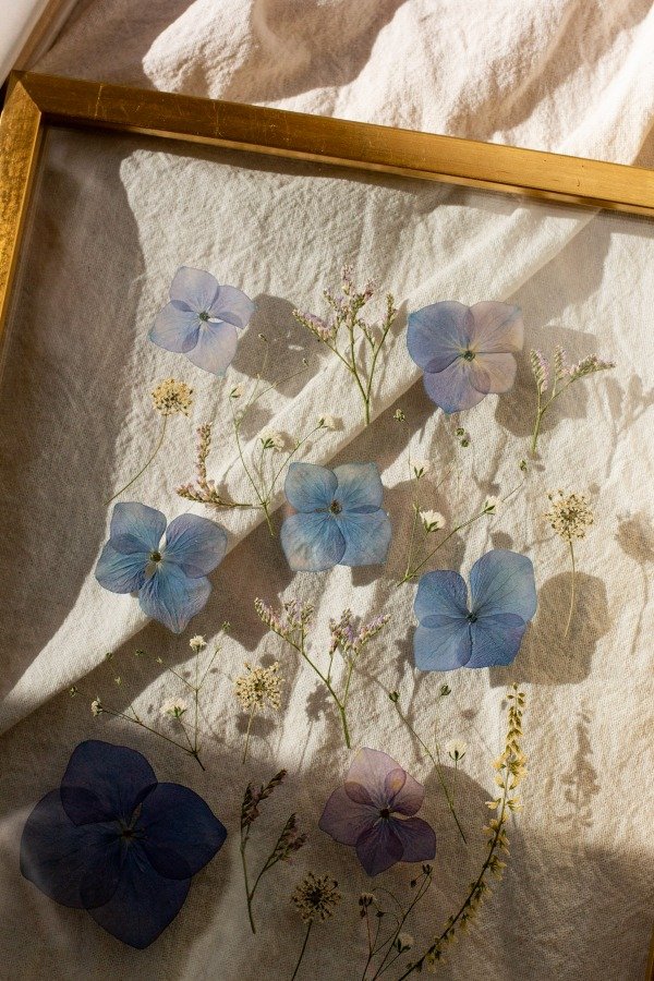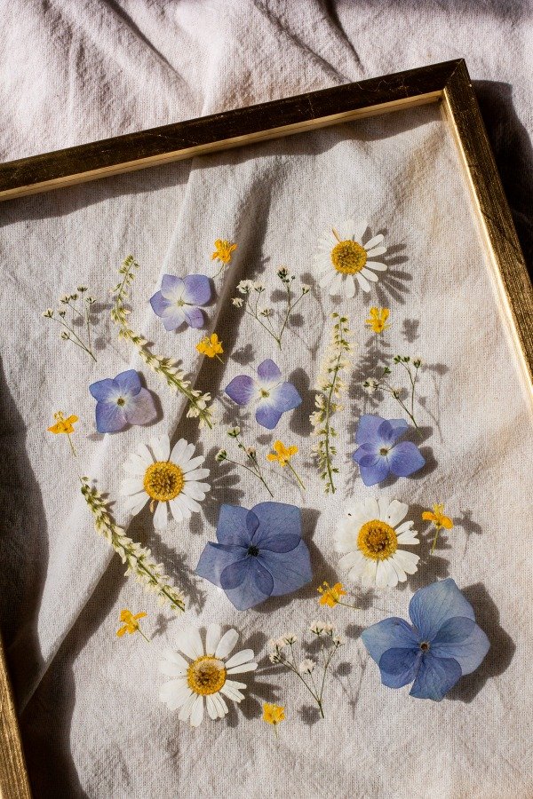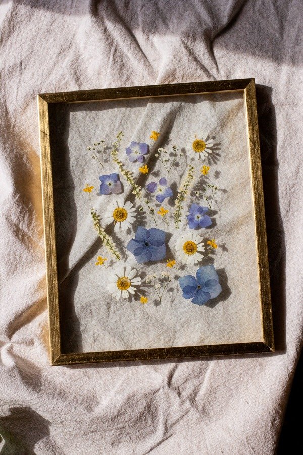 Flores naturales previamente prensadas y secadas enmarcadas artesanalmente en doble vidrio y varilla oro.