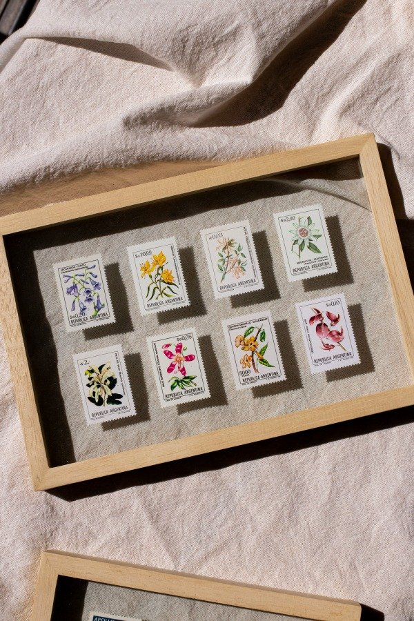 Estampillas argentinas originales de 1982 enmarcadas artesanalmente en doble vidrio y madera marupá.