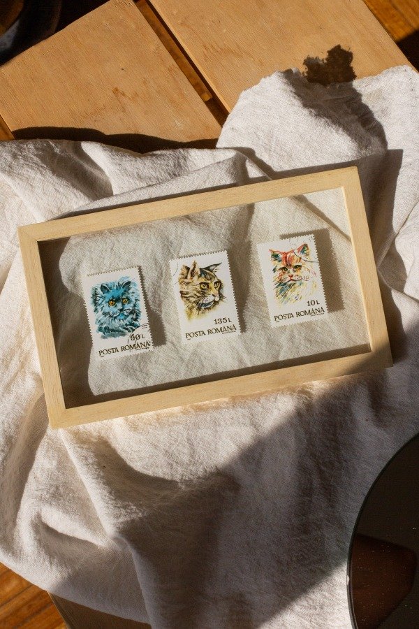 Estampillas originales de Rumania enmarcadas artesanalmente en doble vidrio y madera marupá.