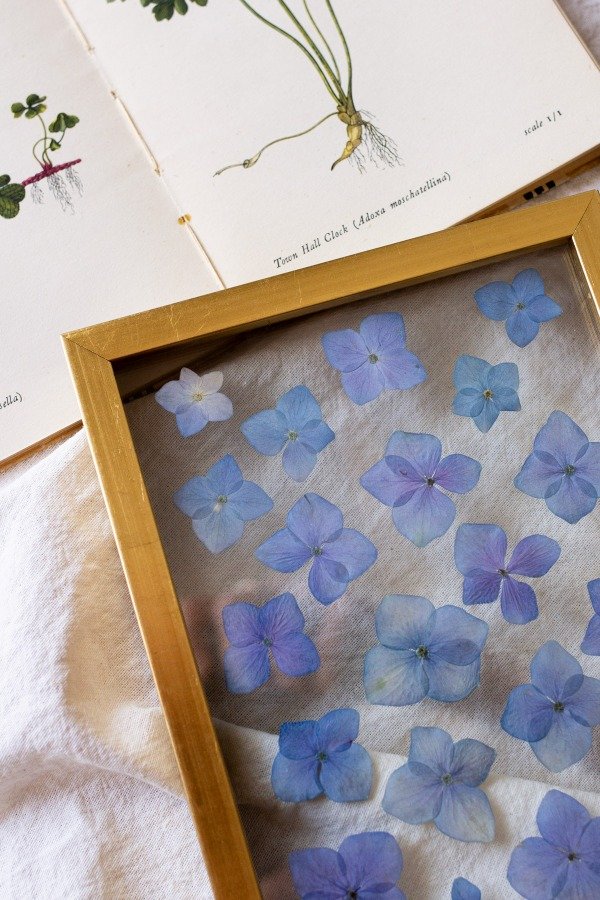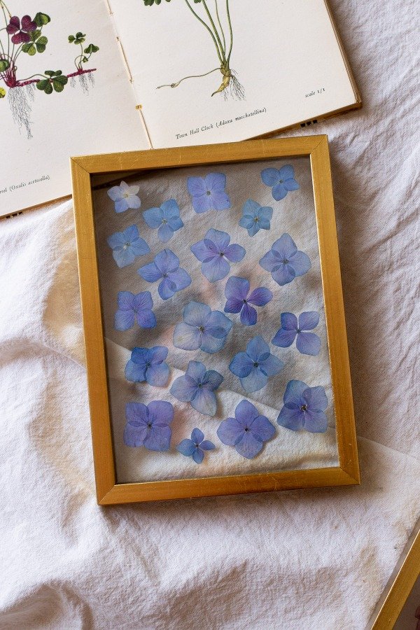 Flores naturales previamente prensadas y secadas enmarcadas artesanalmente en doble vidrio y varilla oro. Listo para colgar.
