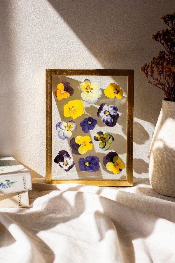 Flores naturales previamente prensadas y secadas enmarcadas artesanalmente en doble vidrio y varilla oro.