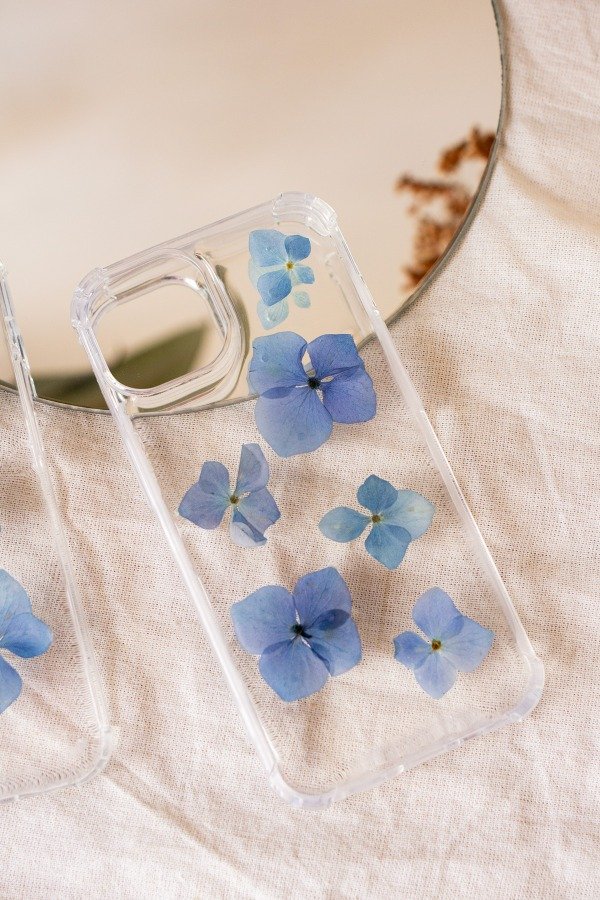 Funda reforzada con esquinas anti golpes para celular personalizada con diferentes flores naturales, cubierta con resina.