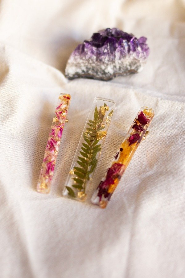 Set de tres hebillas realizadas en resina con flores naturales. Base metálica.