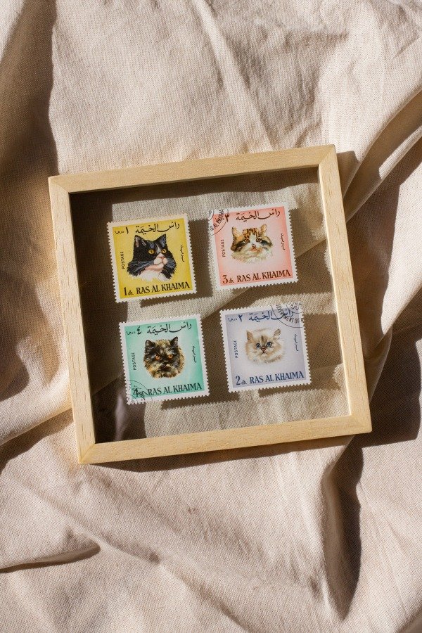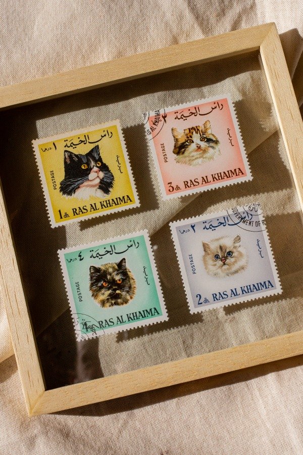 Estampillas originales de Ras Al Kaima enmarcadas artesanalmente en doble vidrio y madera marupá.