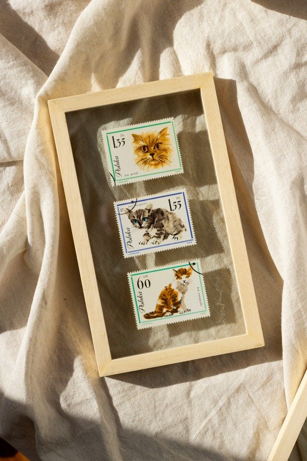 Estampillas originales de Polonia enmarcadas artesanalmente en doble vidrio y madera marupá.