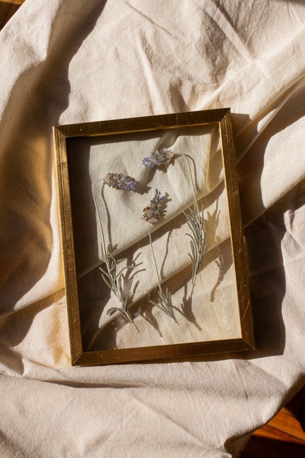 Flores naturales previamente prensadas y secadas enmarcadas artesanalmente en doble vidrio y varilla oro.