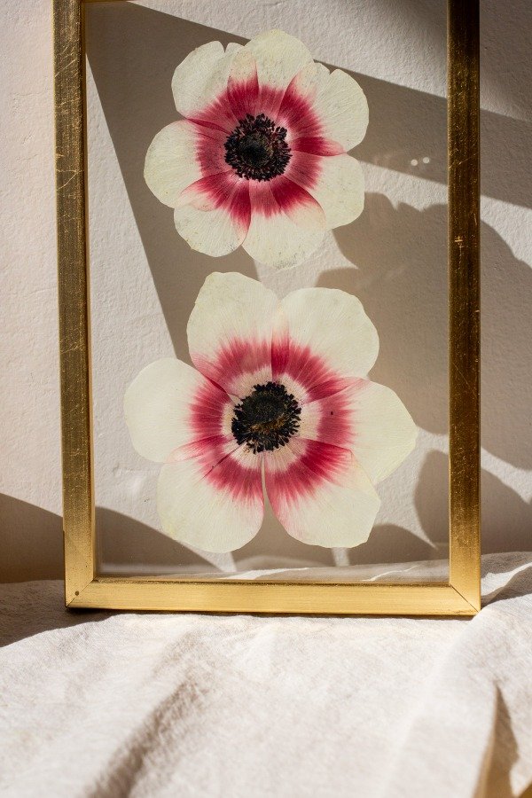 Anémonas prensadas y secadas, enmarcadas en un marco doble vidrio con varilla oro.