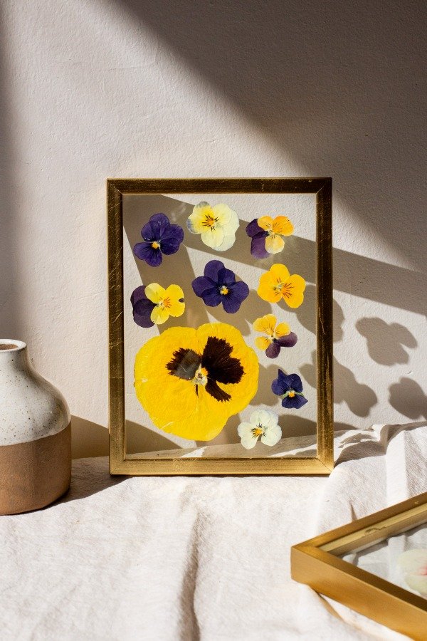Flores naturales previamente prensadas y secadas enmarcadas artesanalmente en doble vidrio y varilla oro.